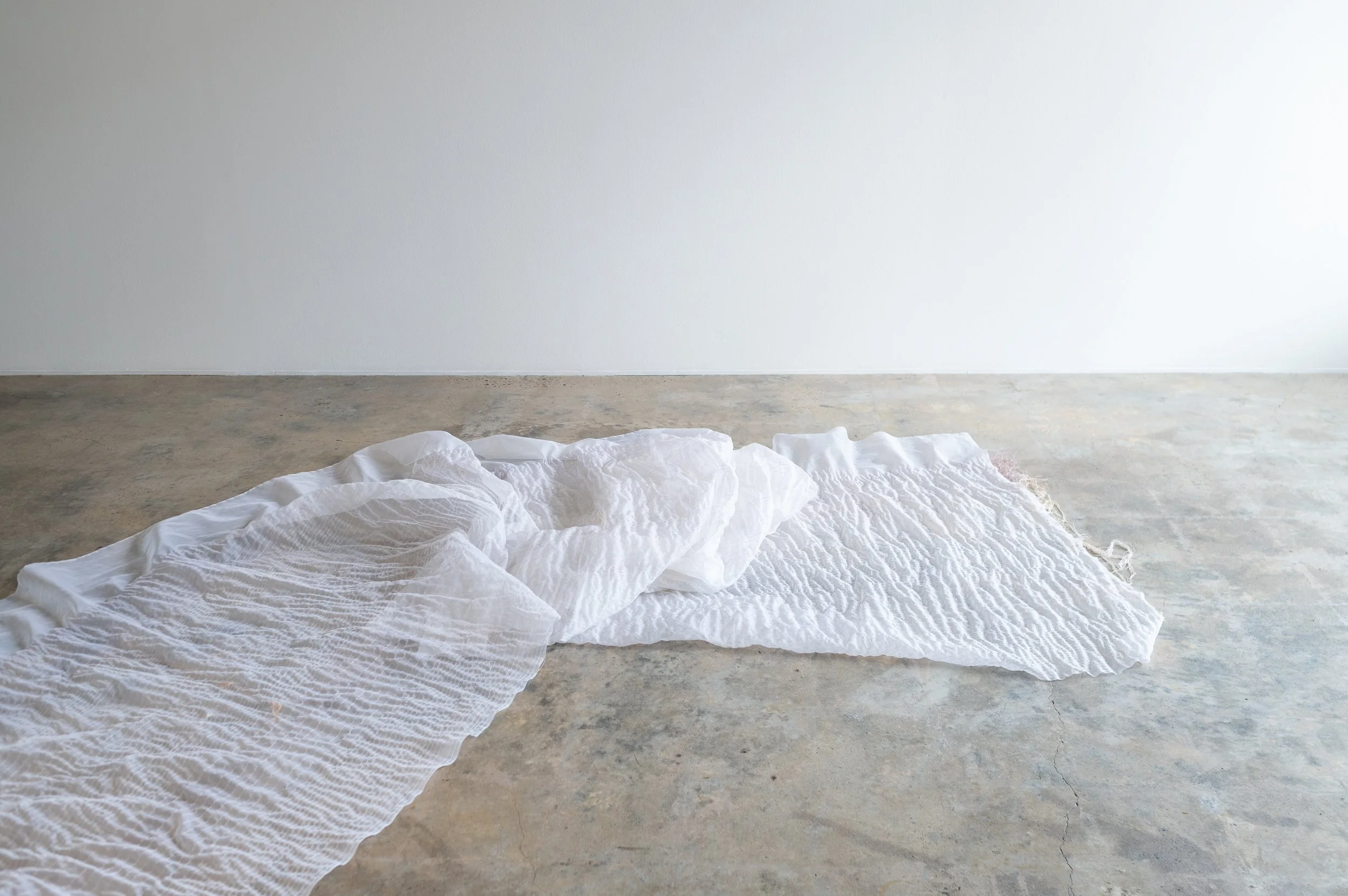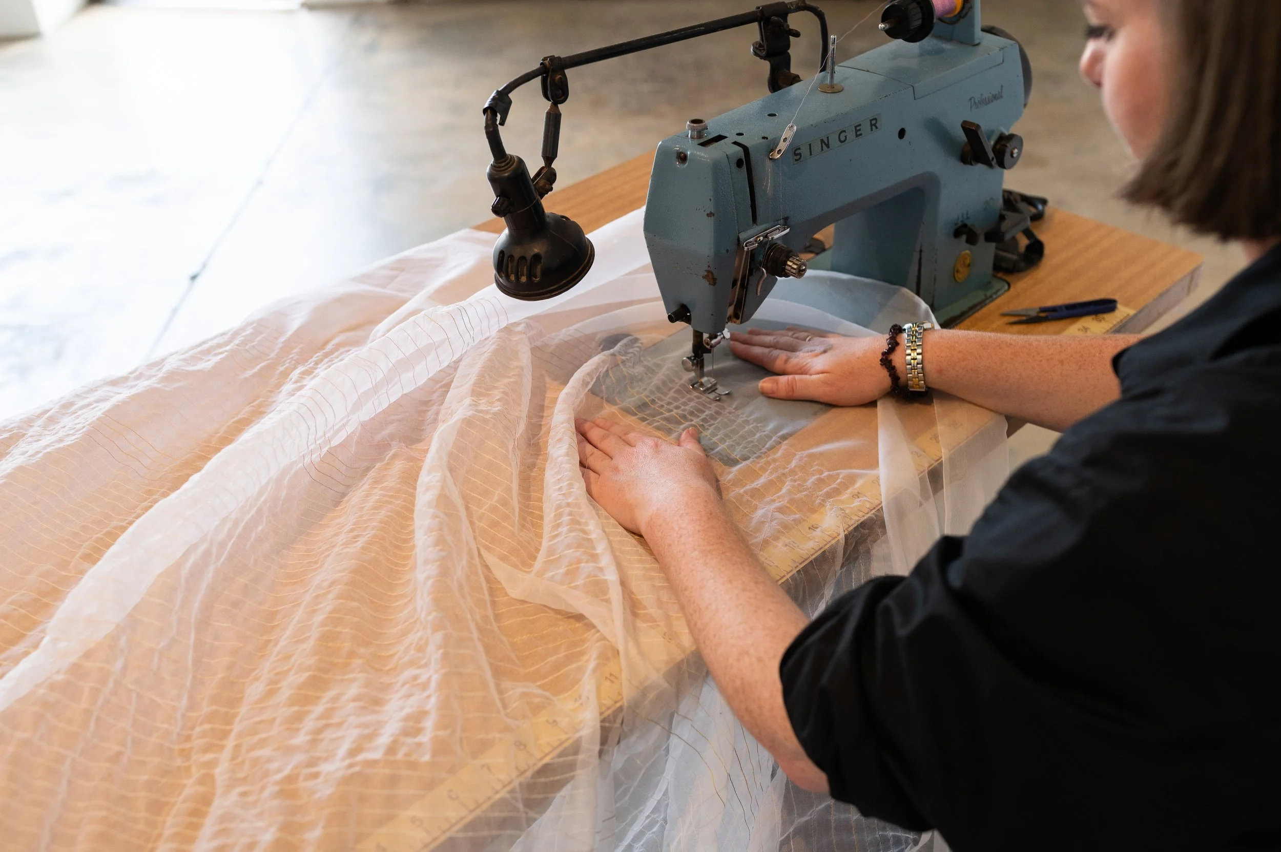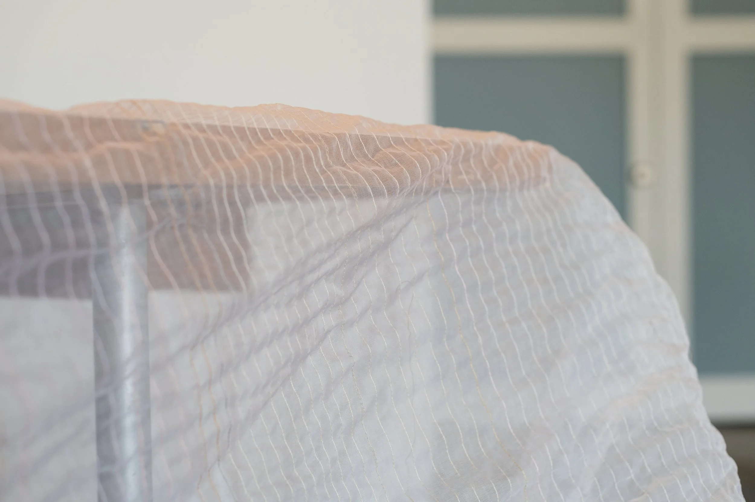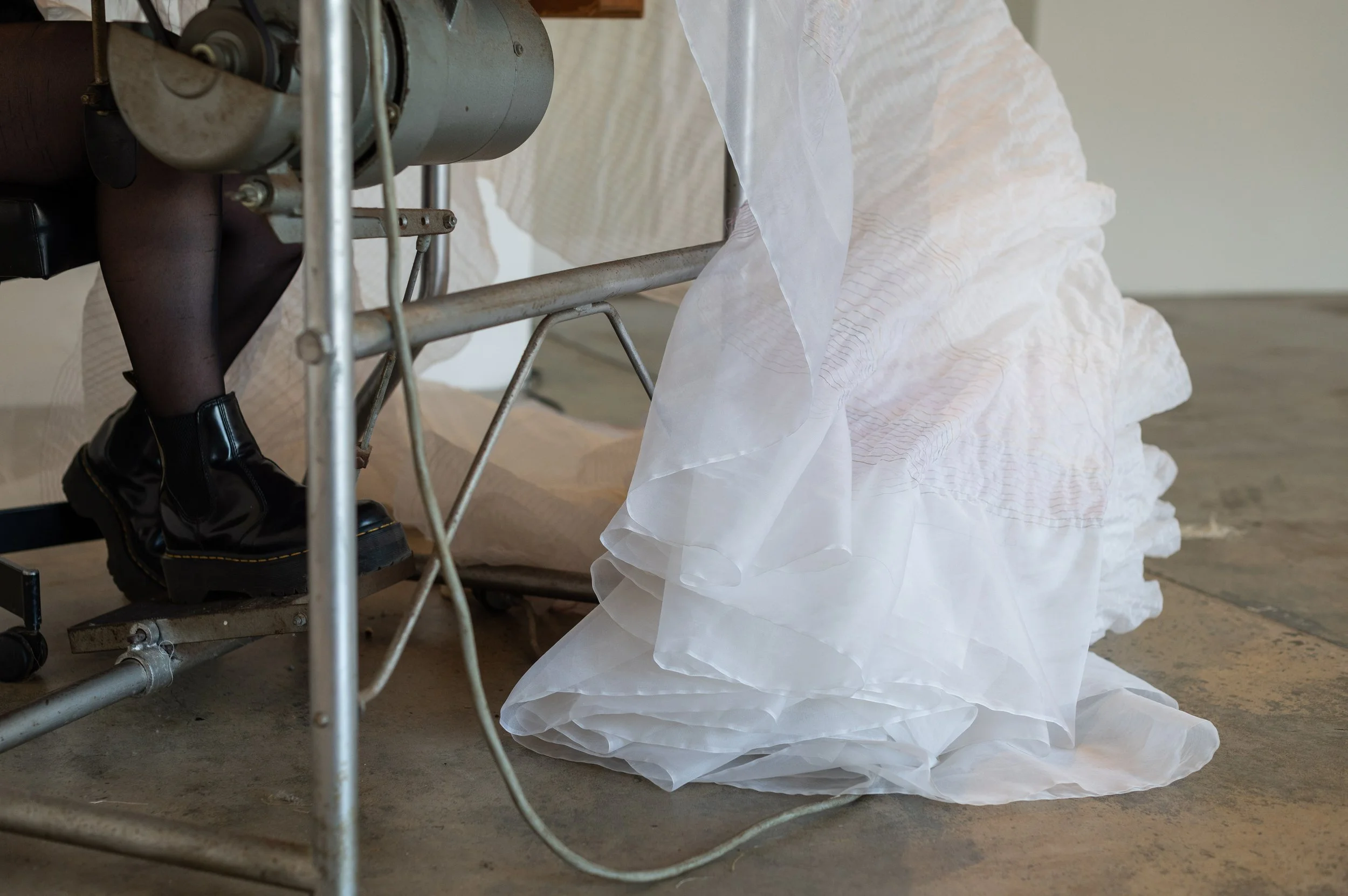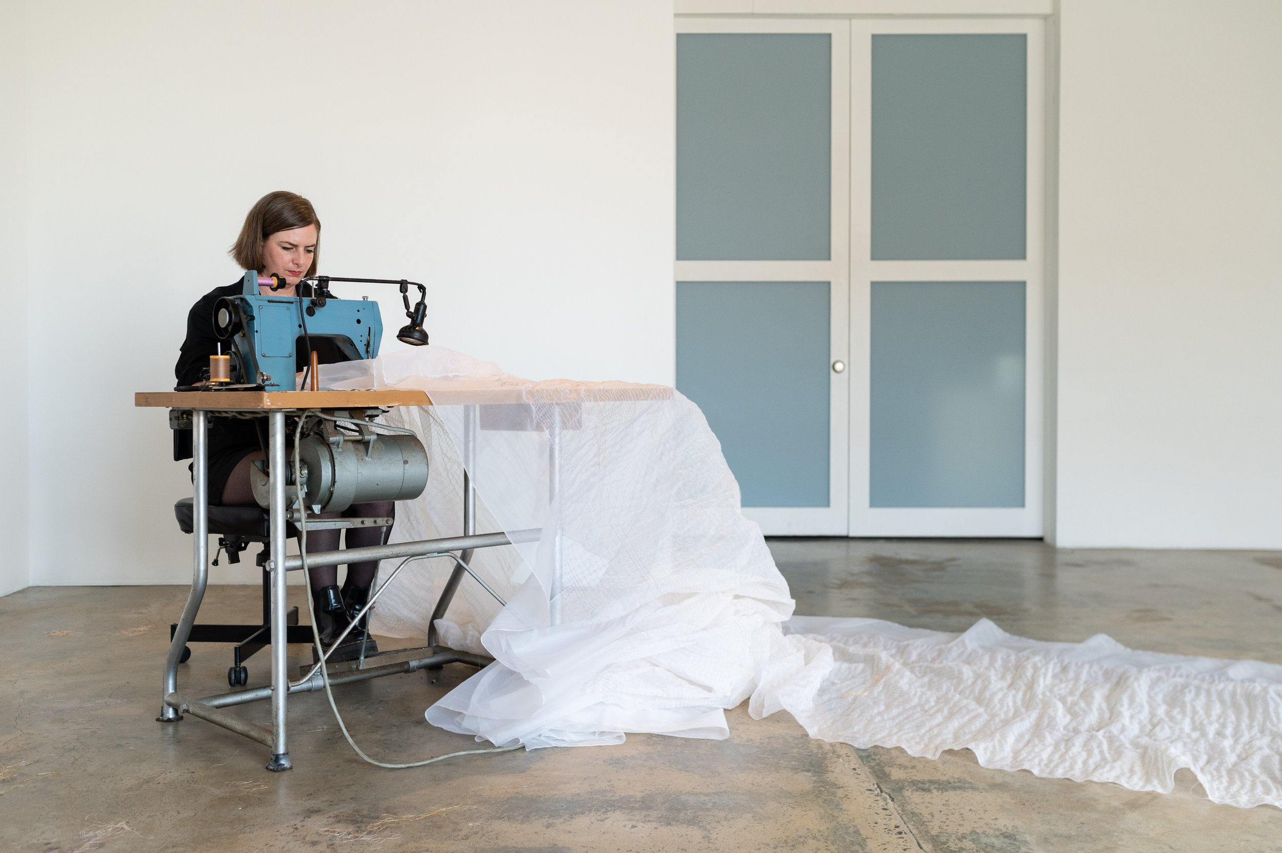 Held in the hours is a durational performance developed through repeated acts of machine stitching using a 1970s Singer 20U industrial sewing machine. Working in sustained dialogue with the machine, the performance foregrounds labour, attention, and accumulation, allowing time, fatigue, and material constraints to shape the work as it unfolds. Straight lines of stitching build slowly across 17 metres of silk organza, with pauses for care, adjustment, and rest becoming integral to the process. Drawing on intergenerational lineages of textile practice and embodied skill, the work traces how knowledge is acquired through repetition and touch, and how forms of women’s labour—often overlooked or rendered invisible—are held in muscle memory, hours of work, and cloth.
